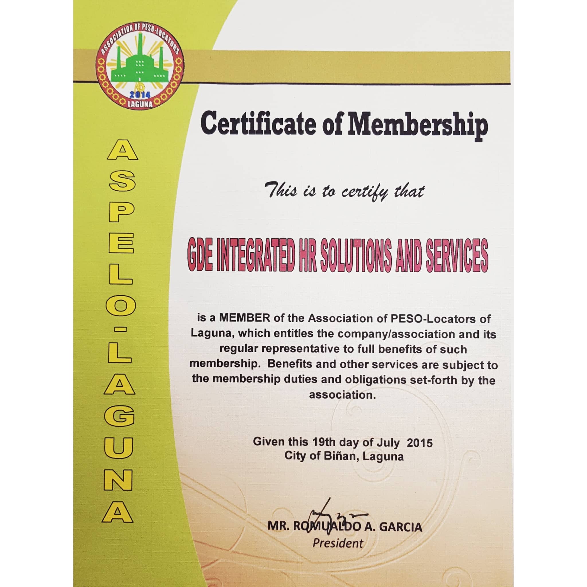 GDE CERTIFICATE OF MEMBERSHIP FROM ASPELO