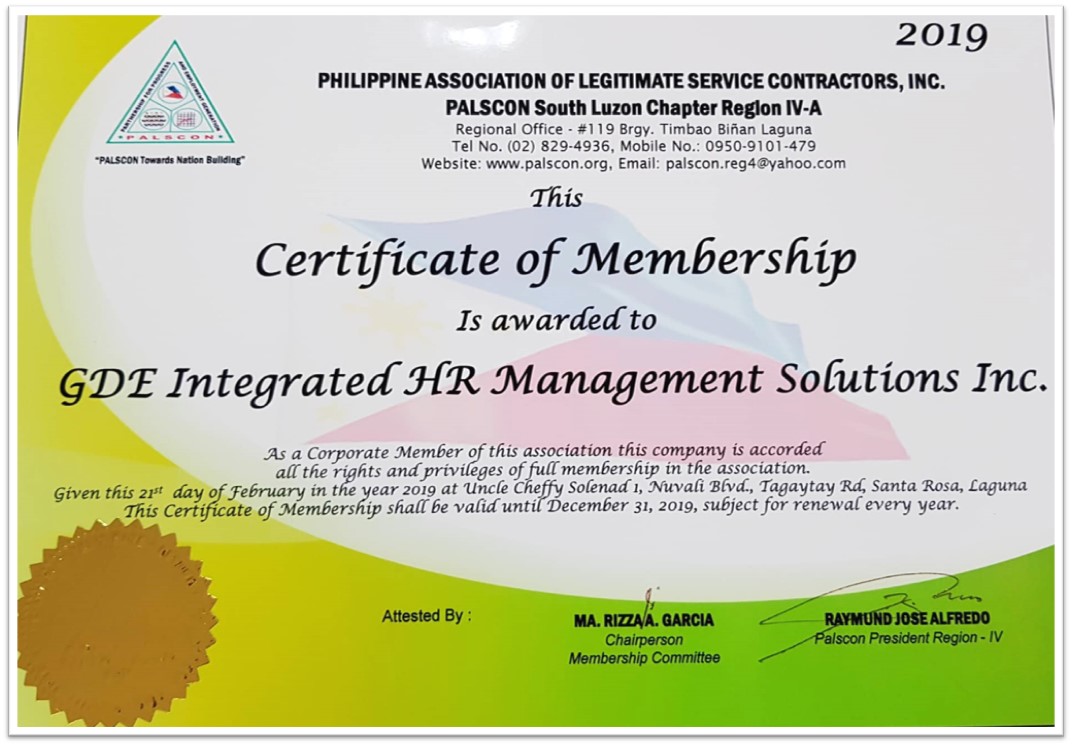 GDE CERTIFICATE OF MEMBERSHIP FROM PALSCON